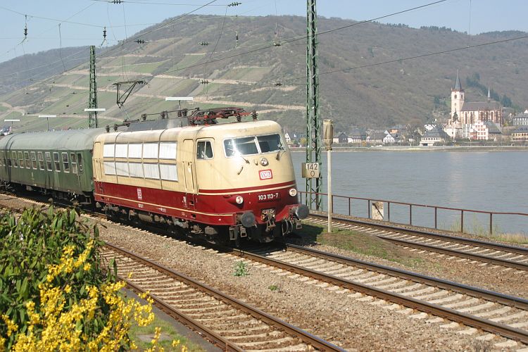 103 113-7 ist am 02.04.2005 mit einem Sonderzug in den Bf Niederheimbach eingefahren